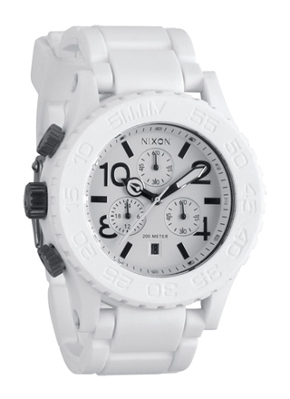 ニクソンを代表するスポーツクロノグラフのケースをラバーで包み込んだ。ラバーによって発色が豊かになるだけでなく、衝撃を吸収してくれるため、少々ラフに扱ってもビクともしないタフな時計に仕上がっている。写真のホワイトを含めて全4色が揃う。