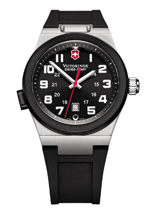 ケースサイド12時位置側にLEDライトを搭載しており、暗闇での作業に役立つ。更に点滅や文字盤をブルーLEDで照らすなど計6つのライティングファンクションを搭載。デザインはスマートだが実用性は高レベル。ビクトリノックスらしいモデルである。