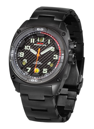 文字盤にLEDライトが仕込んであり、5つのモードで光る。LEDにはブルーとホワイトがあり、様々なシーンで使い分けることができる。これは実際に使用している兵士たちの意見を取り入れたもの。大型ケースでボリュームもあるが、チタン素材を使うことで軽量化に成功し、着け心地にも優れている。