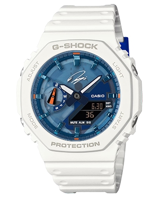 ベースモデルはオクタゴンベゼルのGA-2100で、ゴルフスイング中も邪魔にならない薄型ケースを採用。文字板には闘志を秘めた冷静のブルー、全体は潔さと覚悟を表すホワイト、差し色には希望を意味するオレンジを配色し、どんなゴルフウェアにも合わせやすいカラーリングに仕上げました。また、文字板はスケルトンを採用することで、今までにない印象的なデザインとなっています。石川遼選手のサインを12時位置と裏蓋に施し、トレーディングカードが付属したスペシャルパッケージと合わせ、特別な仕様となっています。