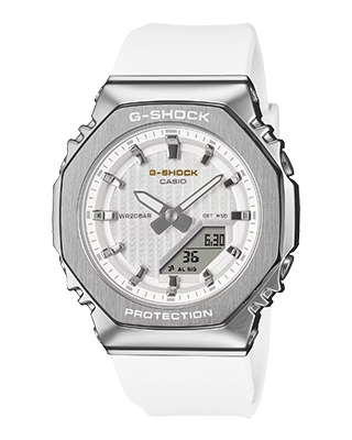 「流れ星」をイメージしたホワイトモデルで、文字板のG-SHOCKのロゴのゴールドは星の輝きを、文字板上のストライプパターンは星が降り注ぐ様子を表現しています。